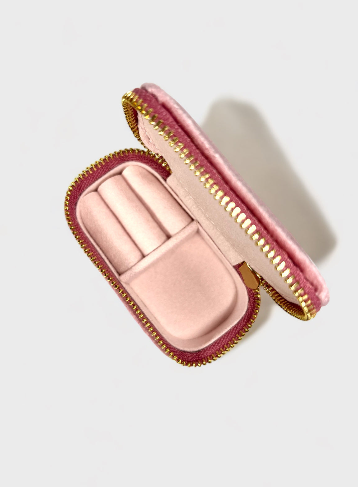 Luxury miniature pink suede travel jewellery organiser specifically designed for rings and other small jewels. The product is finished with gold zip detailing and gold embossed Emjelly logo.